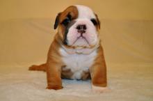From show winning lines Tudorglory Bulldogs presents our stunning boy, Top quailty Pedigree Bulldog pup. He is white and red with free moving tail and good bone structure just like his parents. He has been raised in our home with family memb....