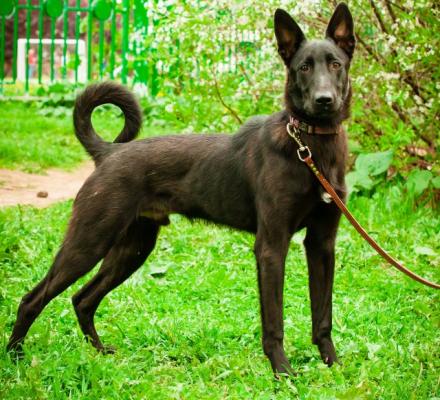 Он метис средних размеров(чуть выше колена), яркого черного окраса с маленьким белым пятнышком на груди.